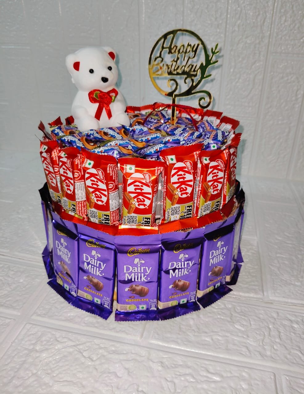 two tier chocolate hamper with the extra toffees and dolled up with a teddy and an acrylic birthday cake topper.
